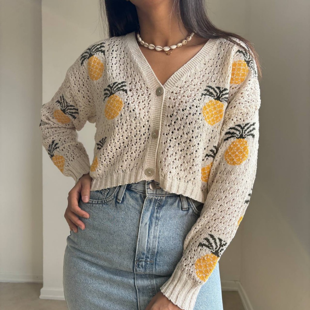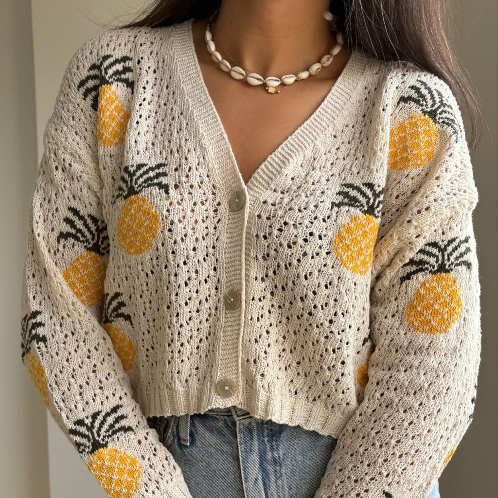 جکت بافت طرح آناناس با بافت برجسته و متفاوت خود، جلوهای خاص و چشمنواز به استایل زمستانی شما میدهد. الیاف نرم و گرم آن حس لطافت و آسایش را در روزهای سرد ایجاد کرده و طراحی طرحدار آن، جذابیت لباس را دوچندان میکند.